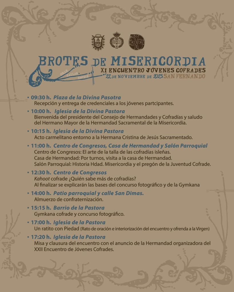 Recordamos el programa del XI Encuentro de Jóvenes Cofrades que se celebrará el sábado 22 de noviembre, organizado por el Grupo Joven de nuestra Hermandad y el Consejo Local de Hermandades y Cofradías.
