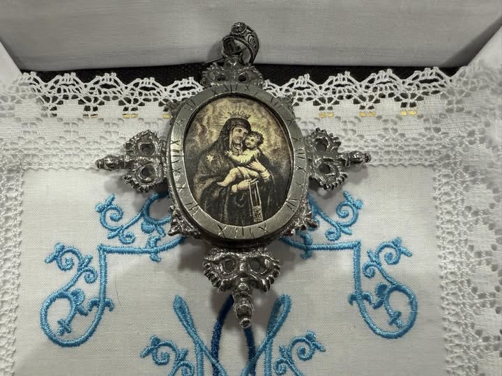 Este relicario de plata, ha sido cuidadosamente elegido ya que en él se representa la imagen de una madre con su hijo en brazos, símbolo del amor filial que une a una madre con su hijo, el mismo amor que pretendemos que sientan hacia nuestra Virgen.
