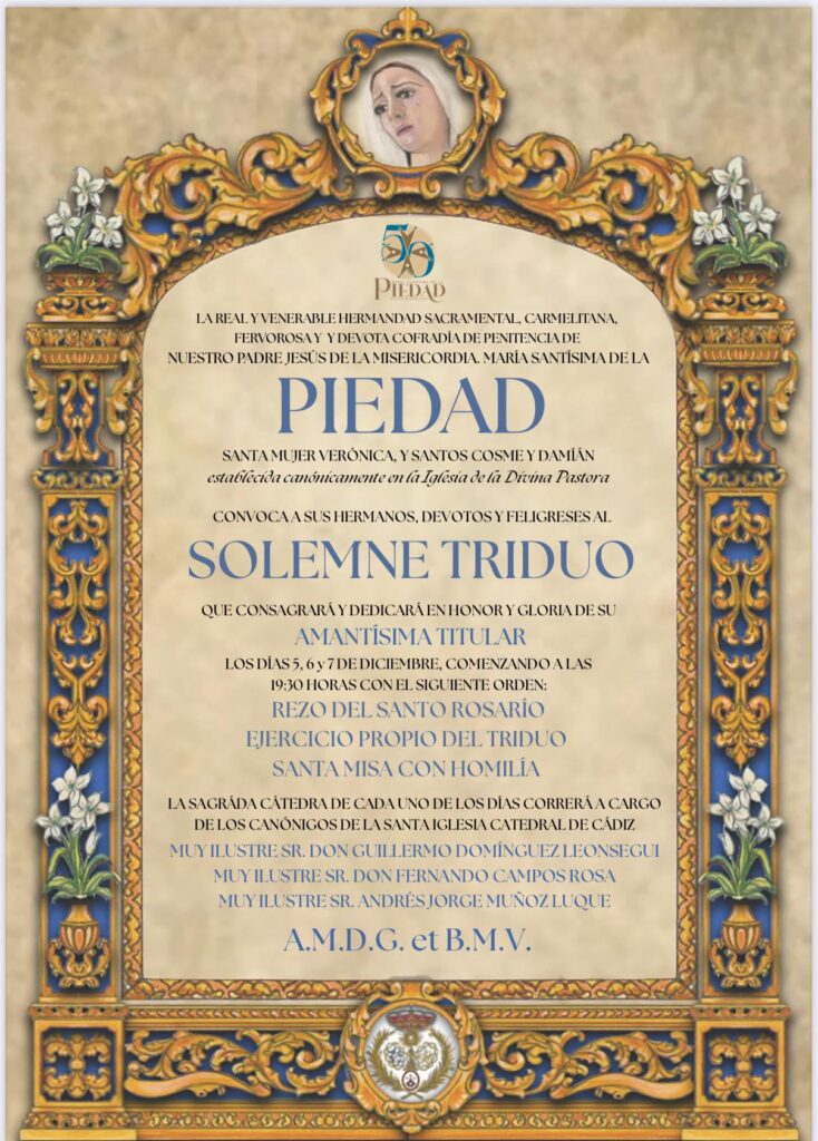 Nuestra Hermandad consagrará Solemnes Cultos en Honor de Nuestra Amantisima Titular, María Santísima de la Piedad desde el viernes 5 al domingo 7 de diciembre, en la víspera de la Solemnidad de la Inmaculada Concepción de la Santísima Virgen María, con motivo del L aniversario de su bendición.