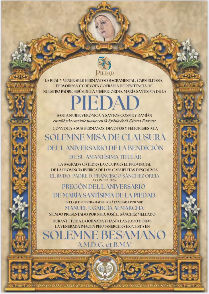 La Hermandad invita a todos los hermanos, devotos y fieles de San Fernando a participar en esta Solemne Misa de Clausura, en la que se elevará la acción de gracias por cincuenta años de amor y entrega a la Virgen de la Piedad, pidiendo que su maternal intercesión siga derramando misericordia y esperanza sobre nuestro barrio, pueblo y hermandad.