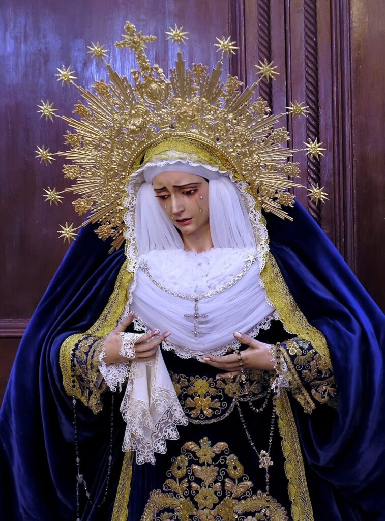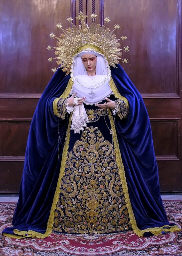 La Virgen luce un tocado de tul claro, manto de terciopelo azul y la saya “torera” que Doña Ana Padilla bordara para la Dolorosa del Jueves Santo en la Pastora.
