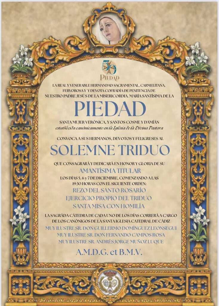 Nuestra Hermandad consagrará Solemnes Cultos en Honor de Nuestra Amantísima Titular, María Santísima de la Piedad desde el viernes 5 al domingo 7 de diciembre, en la víspera de la Solemnidad de la Inmaculada Concepción de la Santísima Virgen María, con motivo del L aniversario de su bendición.