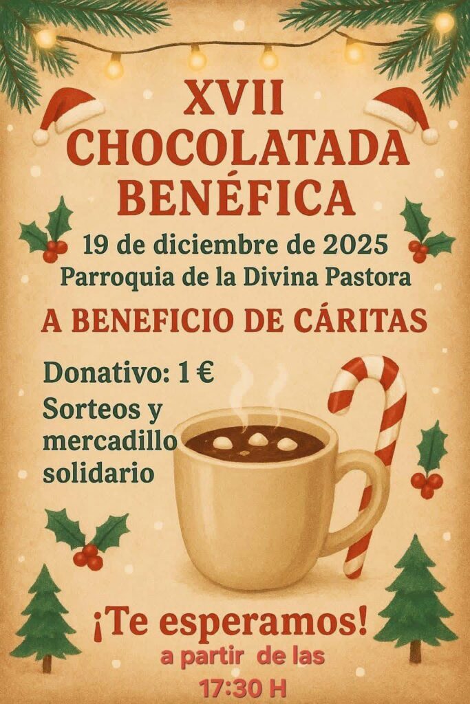 El próximo viernes 19 de diciembre desde las 17:30 tienes una cita con la tradicional chocolatada a beneficio de Cáritas Parroquial que se celebrará junto a un mercadillo solidario en nuestra parroquia.