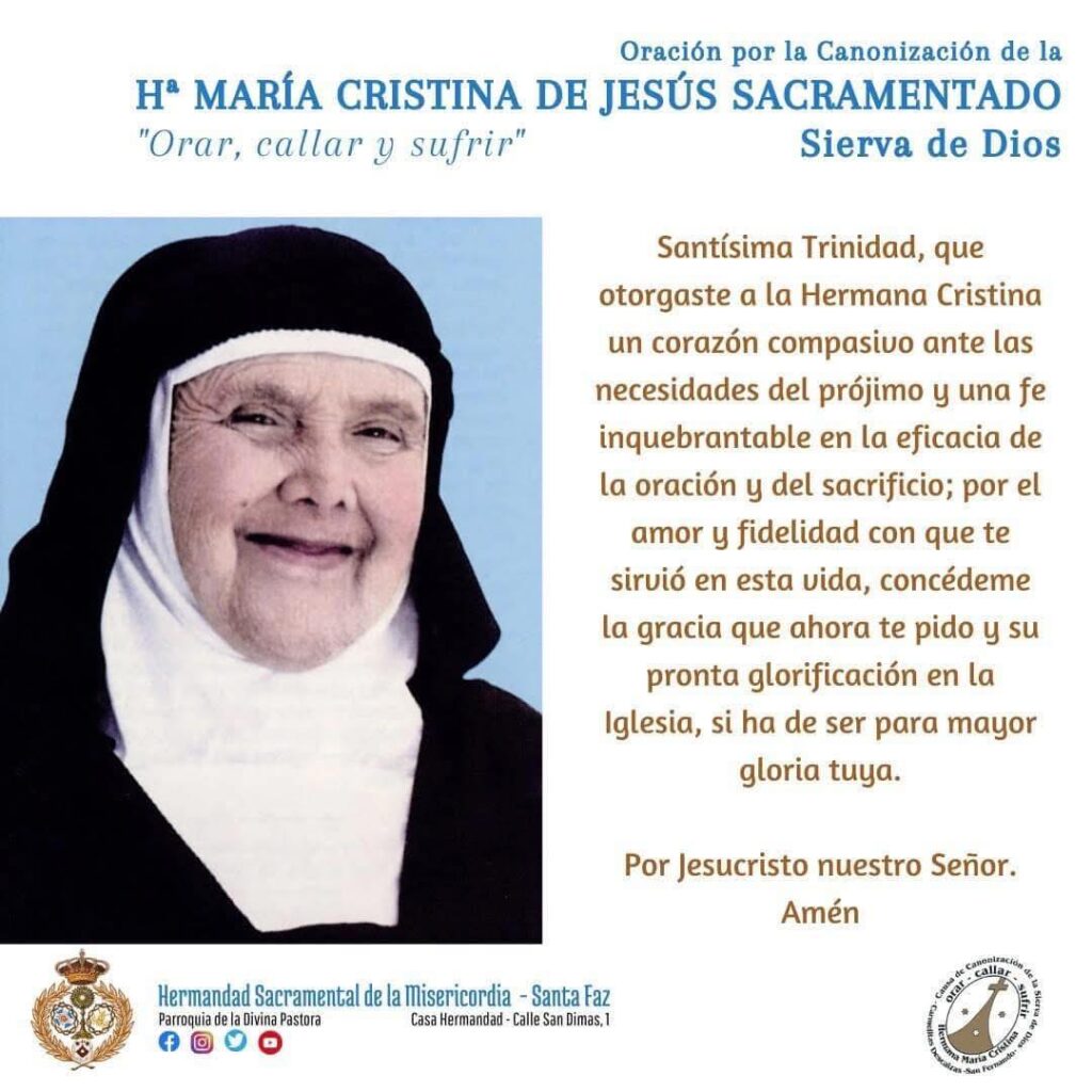 Atendiendo a la llamada del Vice-Postulador de la Causa de Beatificación de nuestra Hermana Cristina, de que hay que llenar las redes sociales de la presencia de esta Sierva de Dios, publicamos hoy 24 del mes donde la recordamos de una manera muy especial, esta estampa con la Oración a aquella que en vida fue la Sonrisa Eterna de Dios.