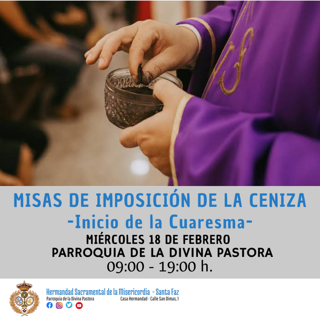 Comunicamos que la parroquia de la Divina Pastora, sede canónica de nuestra hermandad, celebrará las misas de imposición de cenizas a las cenizas a las 09:00 y 19:00 horas.