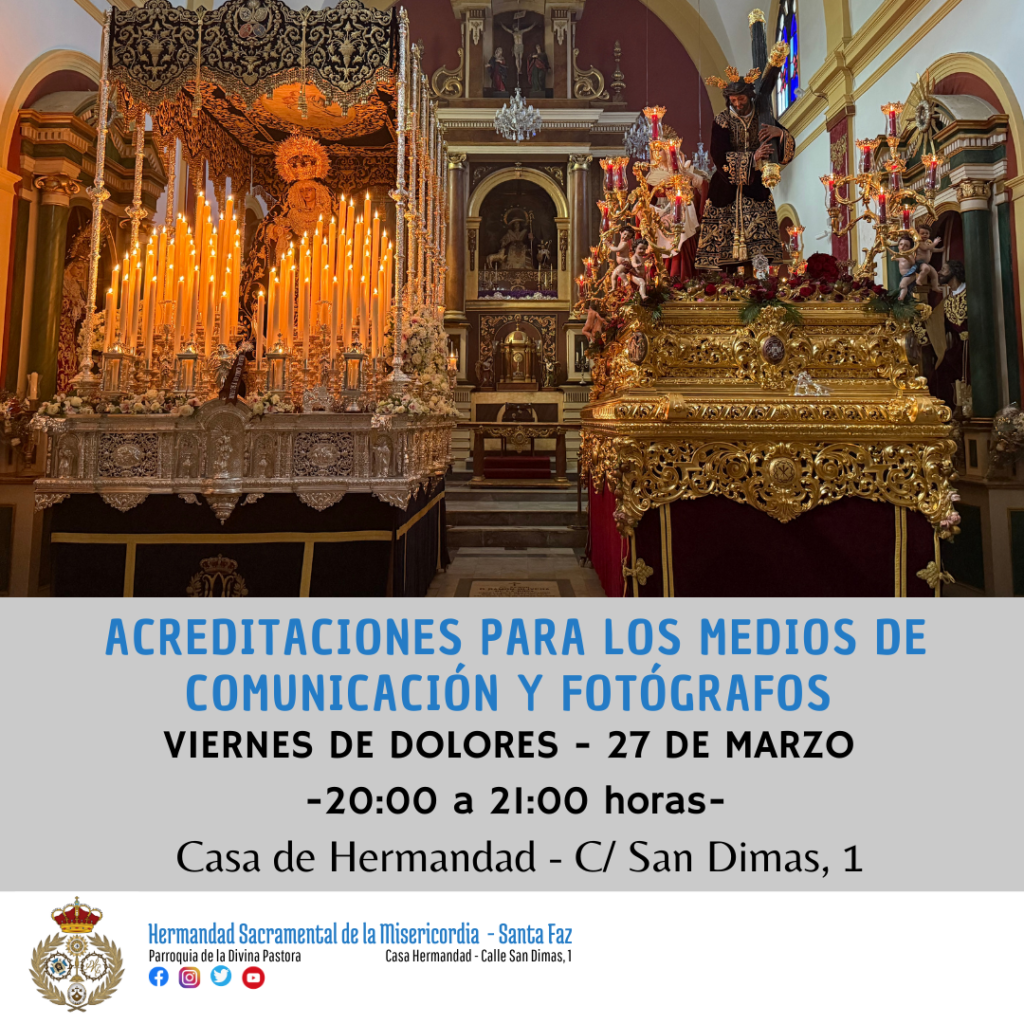Los medios de comunicación y fotógrafos profesionales que deseen asistir a la Salida Procesional desde el interior de la Iglesia de la Divina Pastora, deberán solicitar su acreditación de prensa.