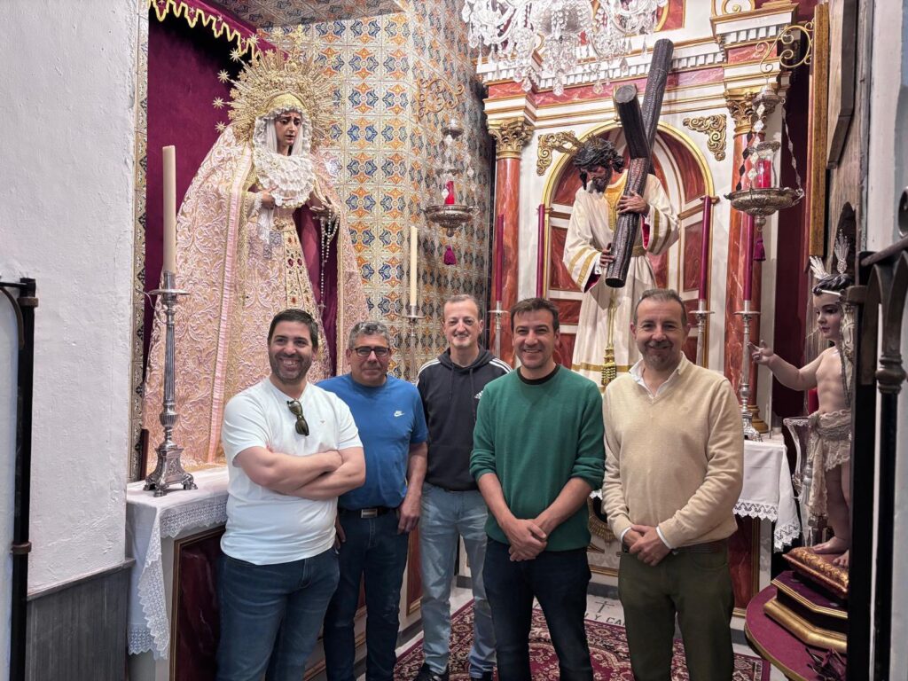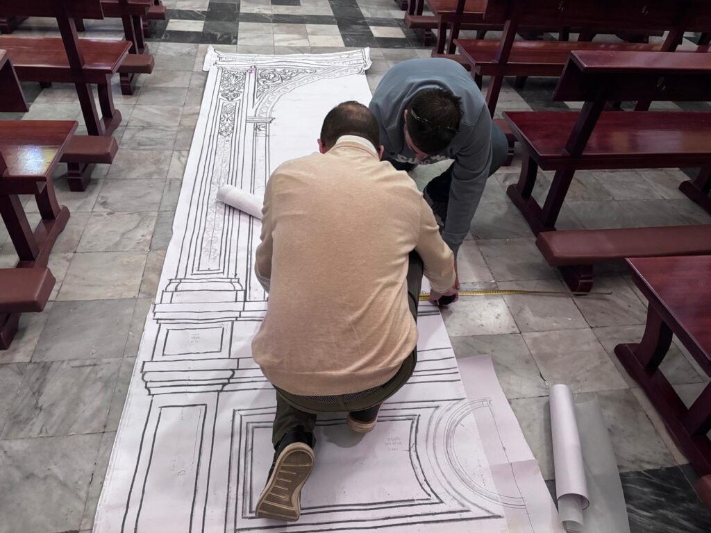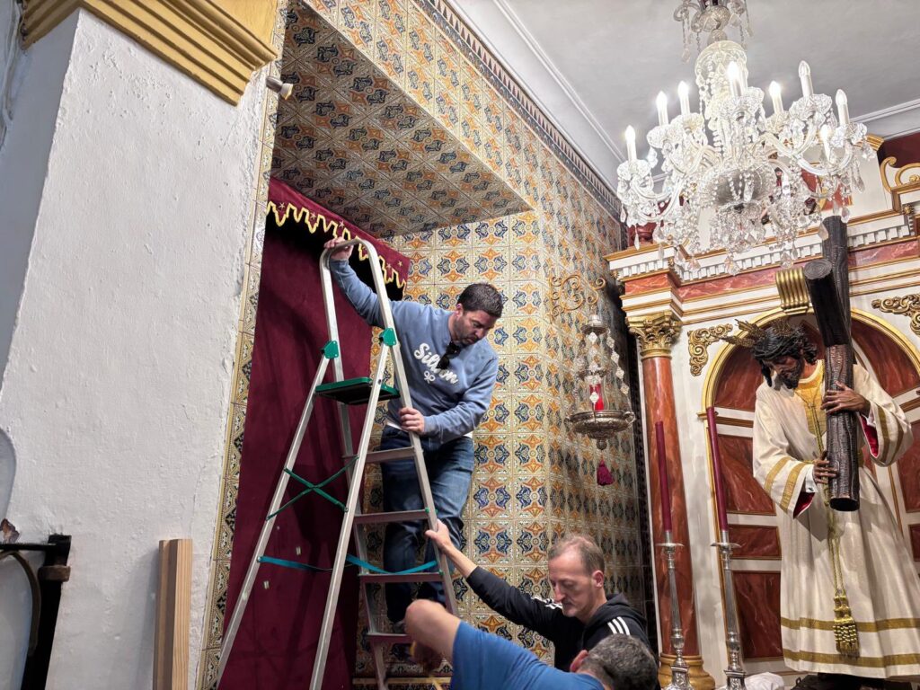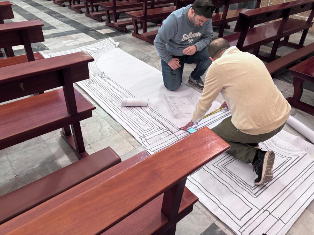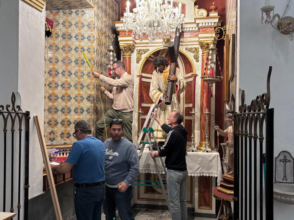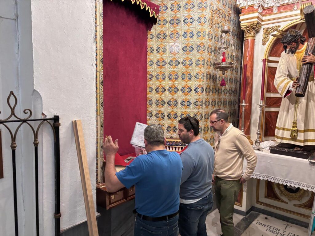 En la jornada de hoy, el hermano mayor junto al equipo de mayordomía han recibido la visita de Juan Carlos García Díaz, autor del retablo, del maestro carpintero Enrique Luque, encargado de la carpintería de la obra, así como del herrero José Ramírez, responsable de la estructura metálica que soportara el retablo. Durante este encuentro, se ha procedido al desmontaje del actual banco de altar, permitiendo realizar las últimas mediciones y contemplar a escala real (1:1) la recreación de este esperado proyecto.