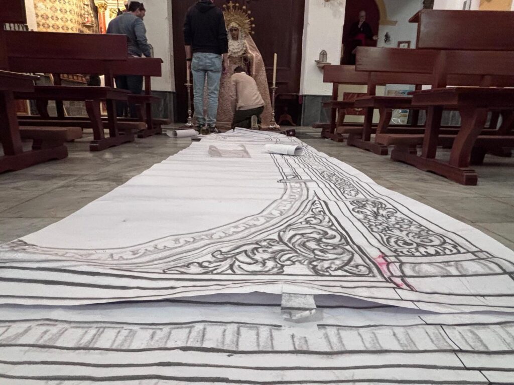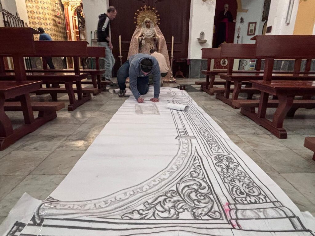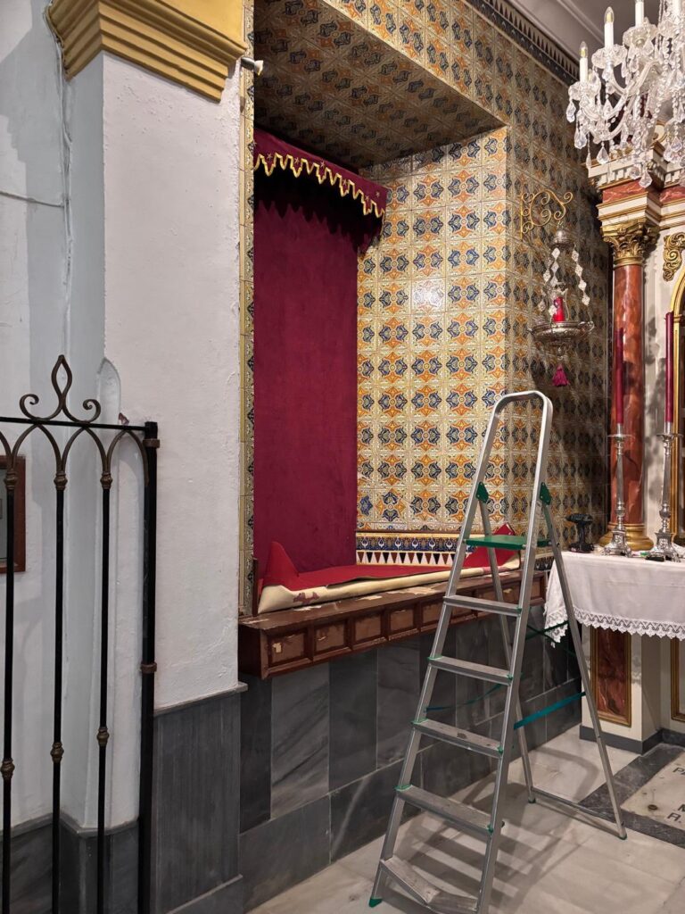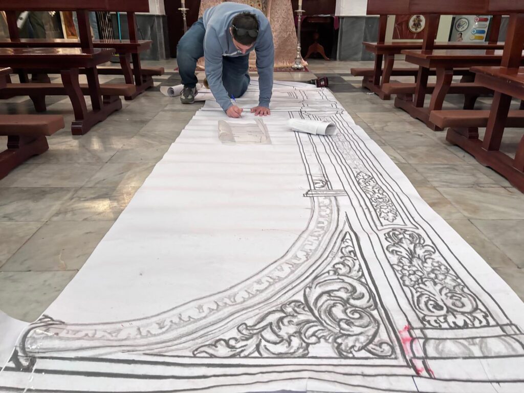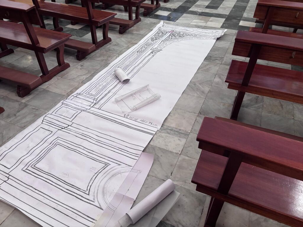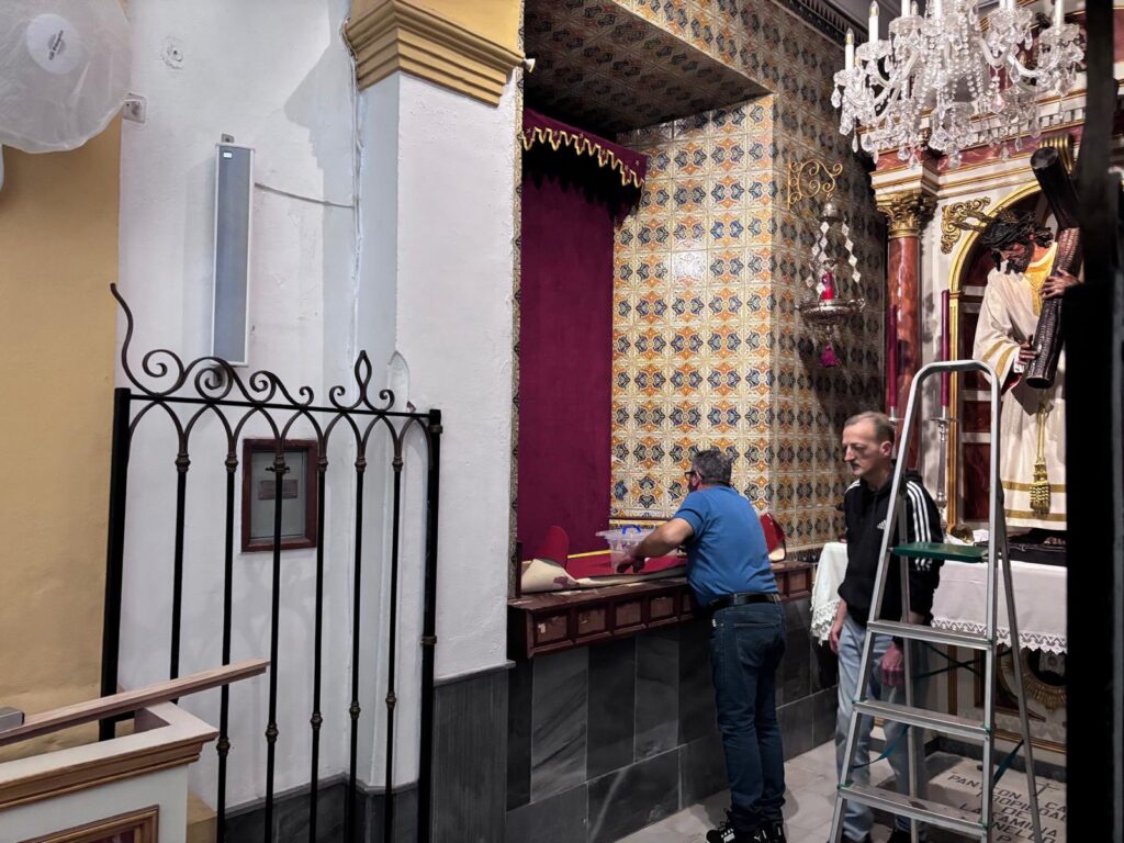 En la jornada de hoy, el hermano mayor junto al equipo de mayordomía han recibido la visita de Juan Carlos García Díaz, autor del retablo, del maestro carpintero Enrique Luque, encargado de la carpintería de la obra, así como del herrero José Ramírez, responsable de la estructura metálica que soportara el retablo. Durante este encuentro, se ha procedido al desmontaje del actual banco de altar, permitiendo realizar las últimas mediciones y contemplar a escala real (1:1) la recreación de este esperado proyecto.