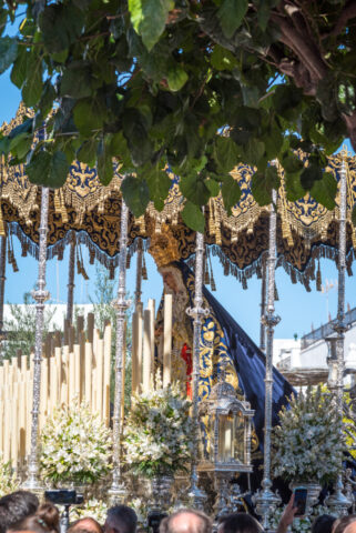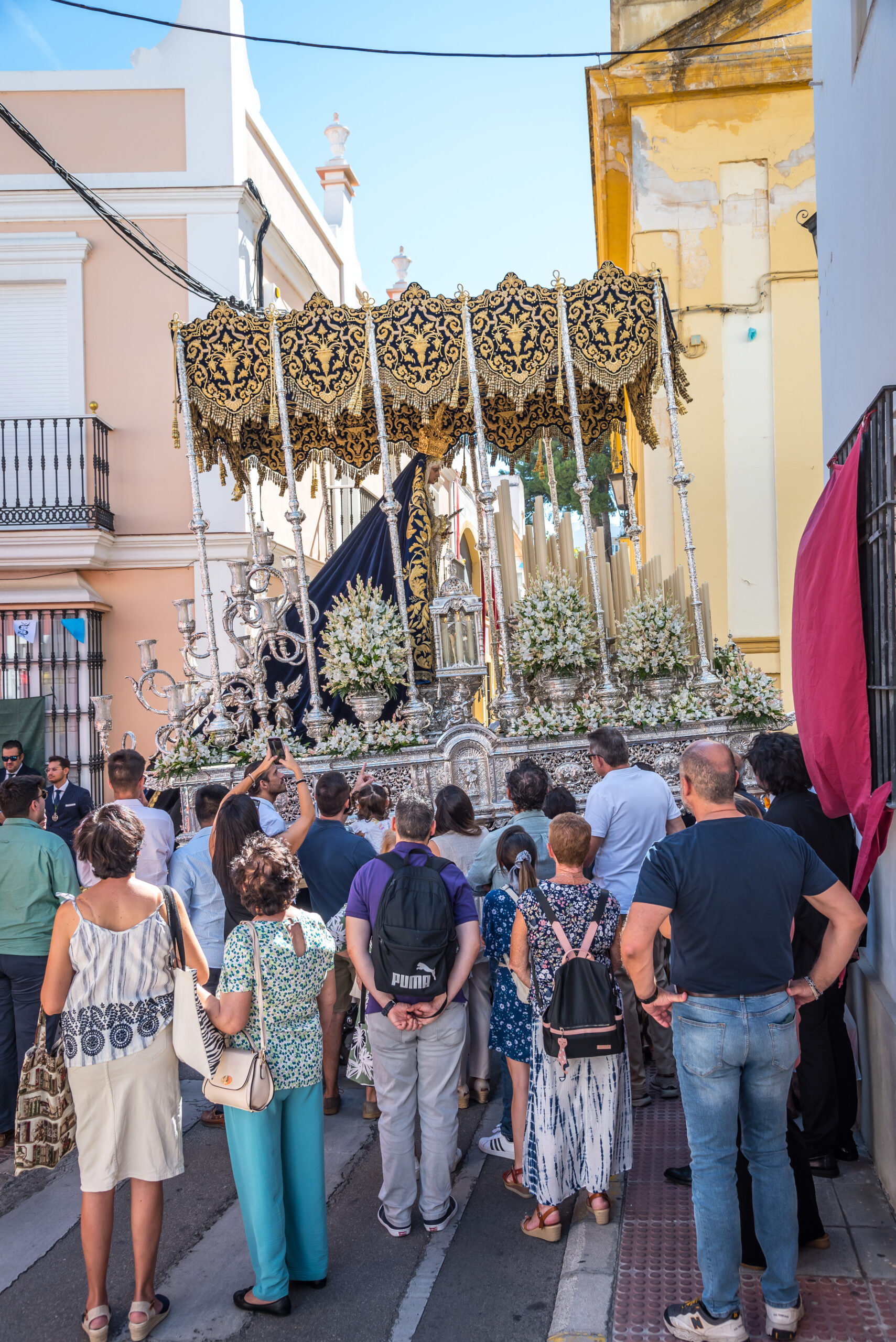 La Virgen de la Piedad quedaba expuesta de una manera maravillosa, gracias a la cesión de la Hermandad de los afligidos del manto de calle de su amantísima titular, demostrando una vez más los vínculos históricos que unen a ambas corporaciones penitenciales. La música de aquella jornada también fue algo extraordinario. Además de contar con la banda de San José Artesano de nuestra ciudad, banda que estuvo ligada a nuestra hermandad durante más de 10 años, tuvimos la suerte de tener para el traslado de ida él acompaña miento de la afamada banda de música “El Sol” de Sevilla. Ambas formaciones ofrecieron un repertorio escogido donde las marchas clásicas de autores reconocidos centraron los puntos más álgidos del recorrido, teniendo también algunos momentos para la música cofrade más reconocible de los últimos tiempos.